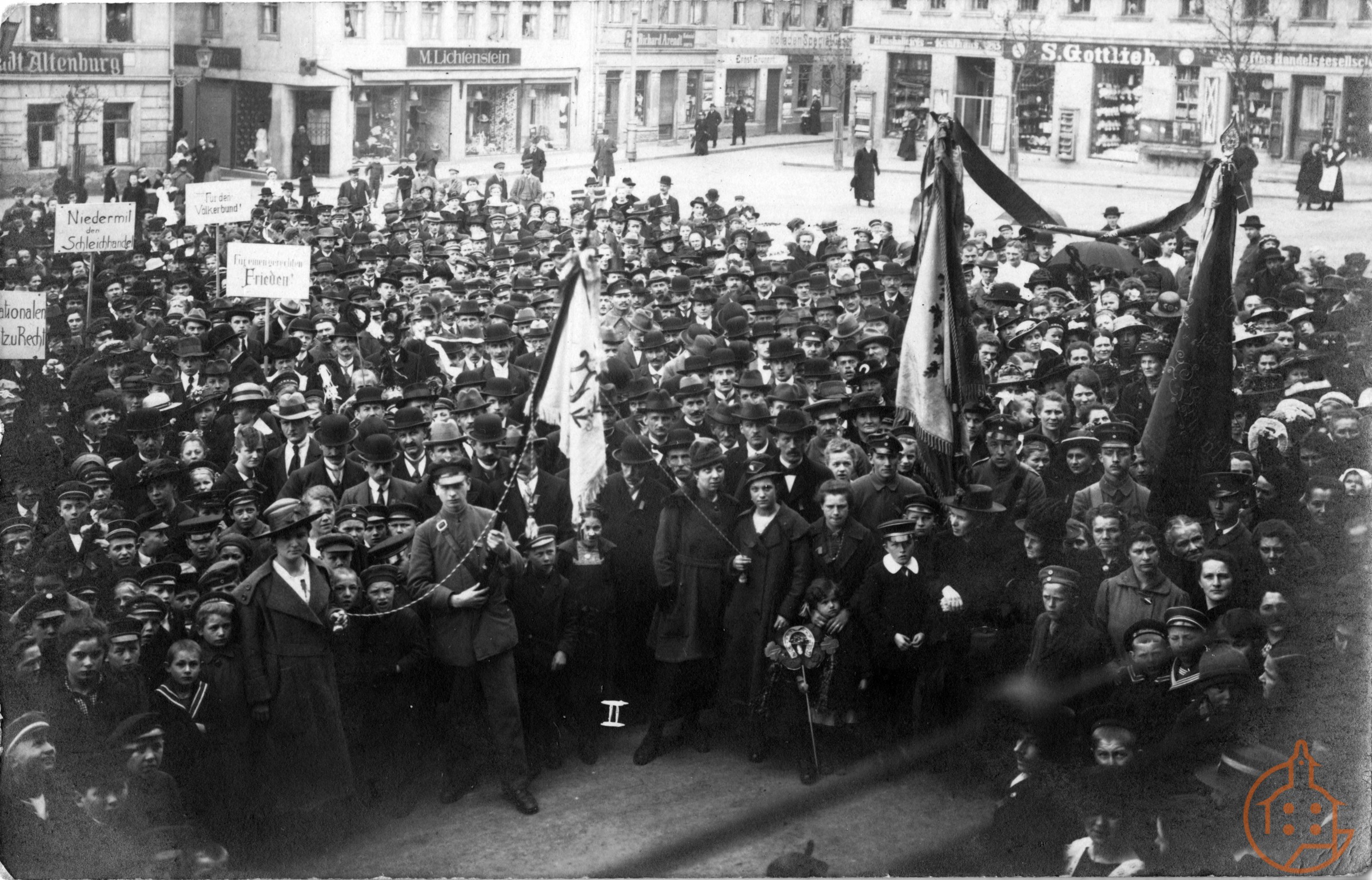 Plakataufschriften: "Für den Völkerbund" ; "Für einen gerechten Frieden" ; "Nieder mit dem Schleichhandel"