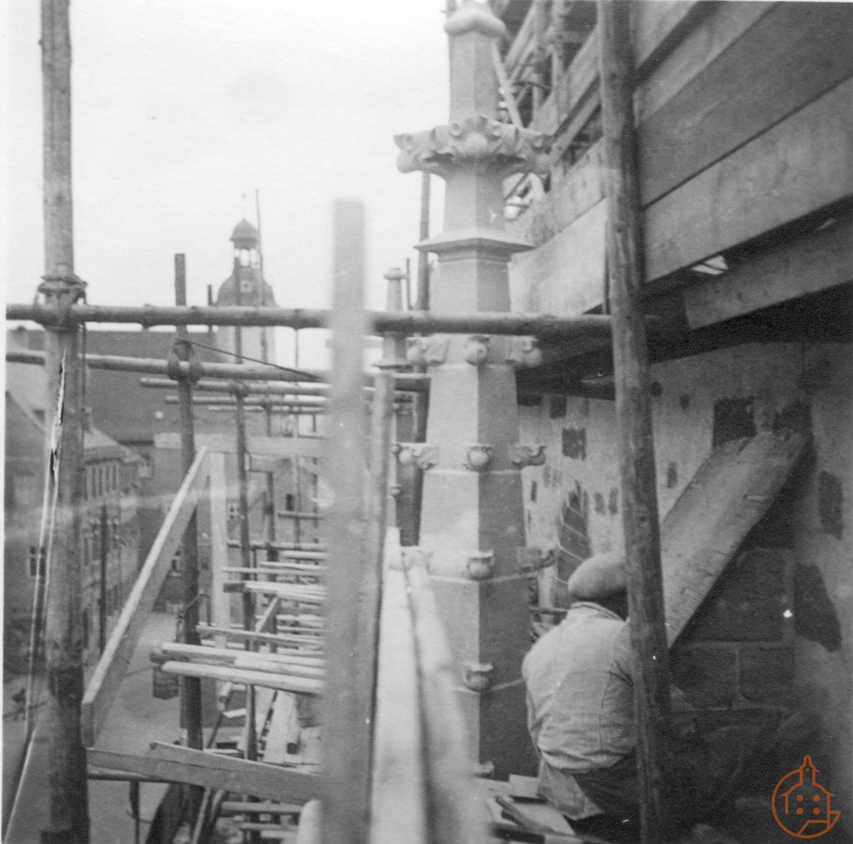 Steinmetz bei der Arbeit auf dem Gerüst an der Stadtkirche St. Nicolai