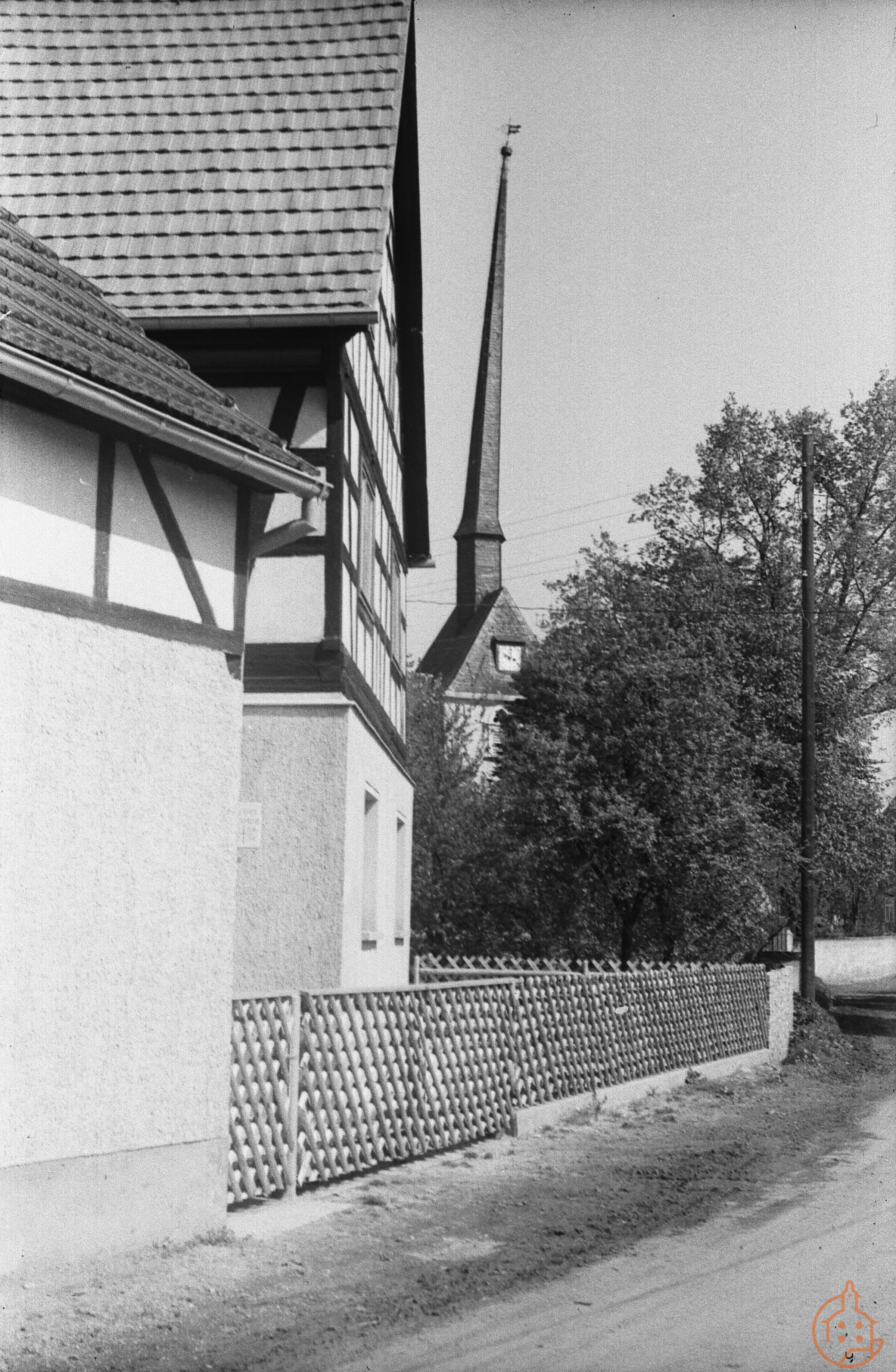 Teil des Pfarrhauses in Großstöbnitz mit Blick zum schiefen Kirchturm