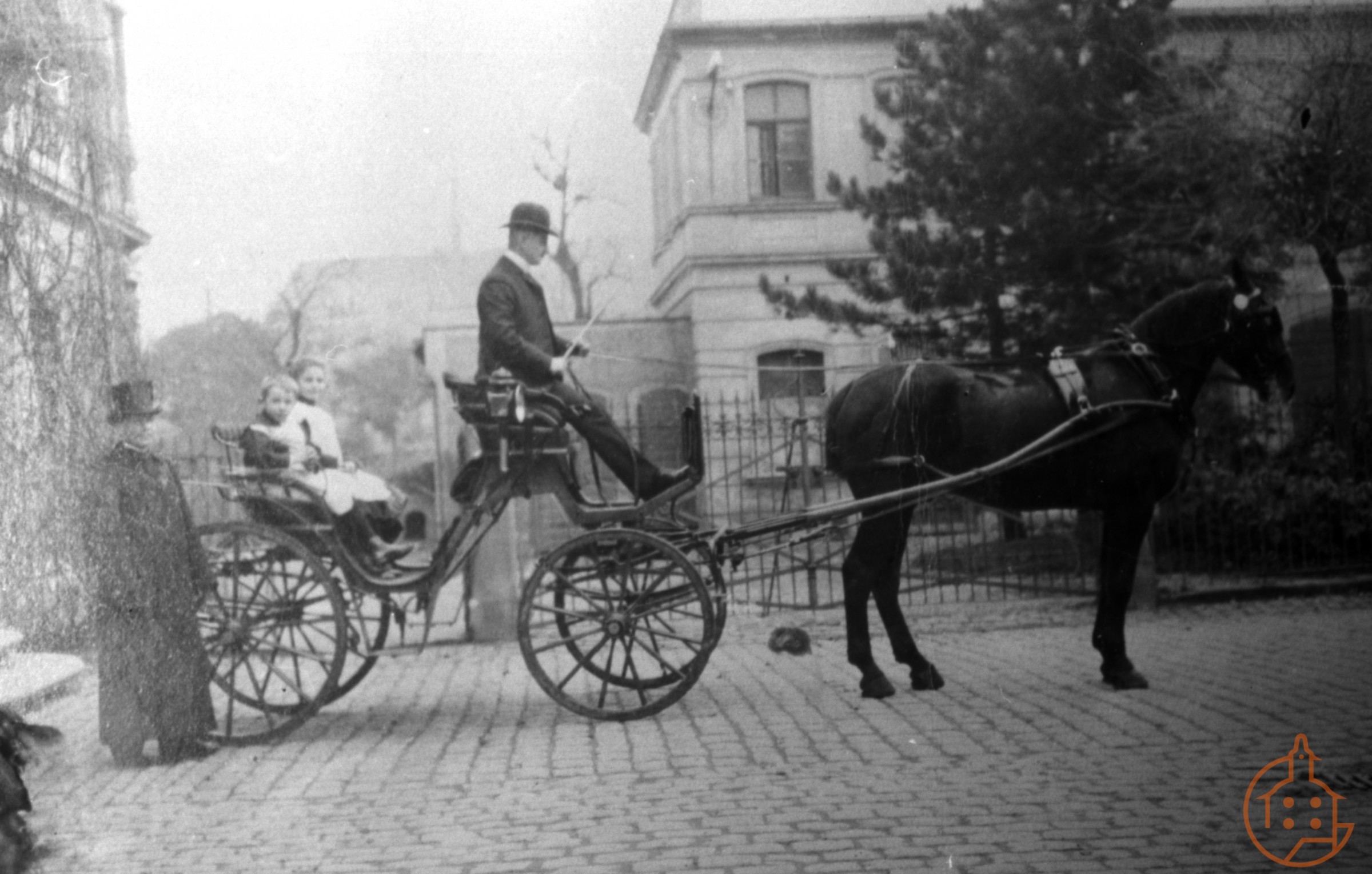 Pferdekutsche vor der Villa der Familie Valentin Donath auf dem Brückenplatz - in der Kutsche sitzen Herbert Donath und seine ältere Schwester Ilse
