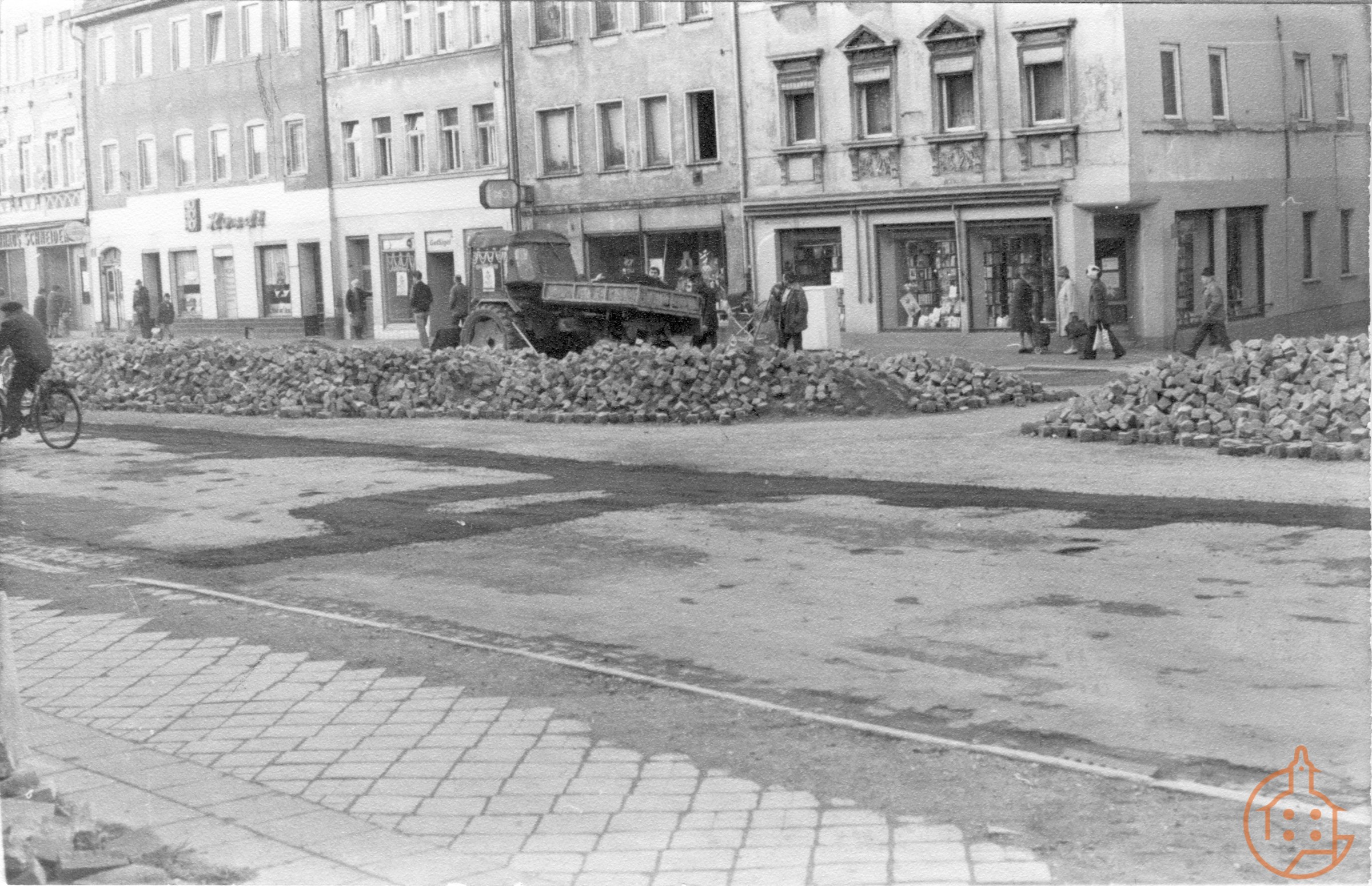 Lagerung von Pflastersteinen aus der Robert-Koch-Straße auf dem Marktplatz zum Weitertransport