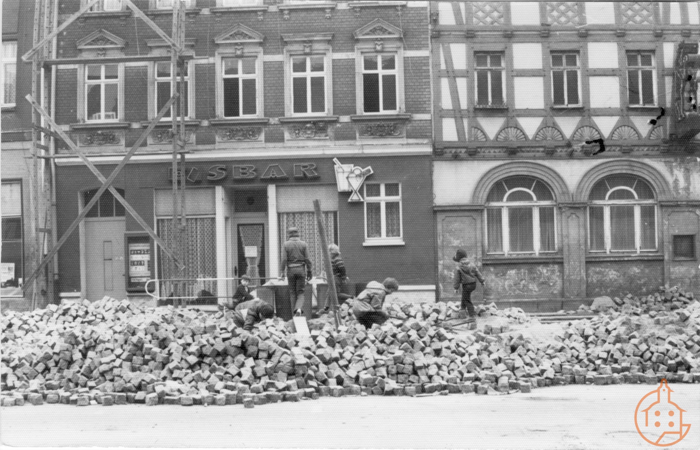 Lagerung von Pflastersteinen aus der Robert-Koch-Straße auf dem Marktplatz zum Weitertransport