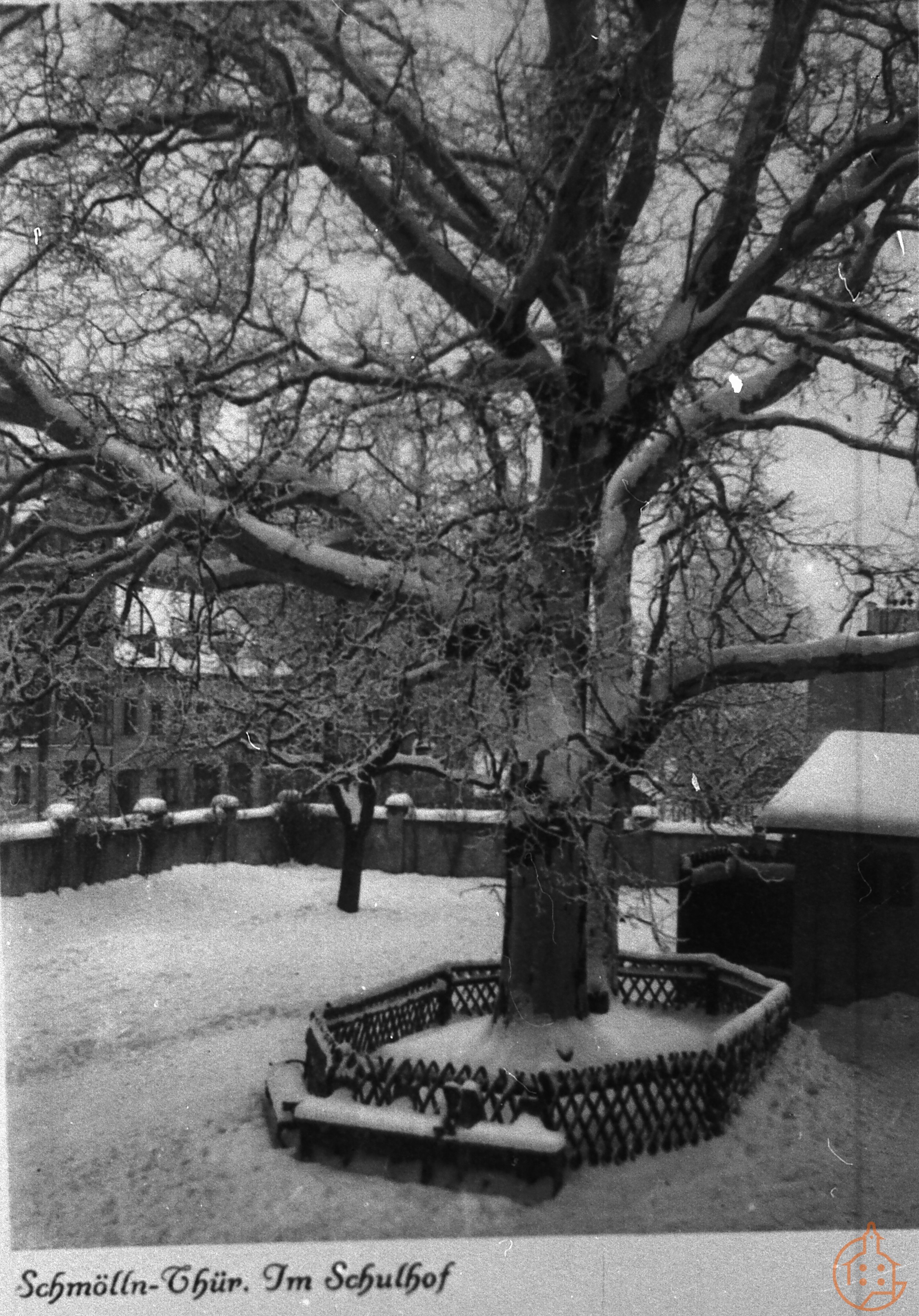 Platane im Hof der unteren Schule. Erweiterte Oberschule, Berufsschule, Gymnasium. Vor dem Bau der Neuen Schloßstraße.