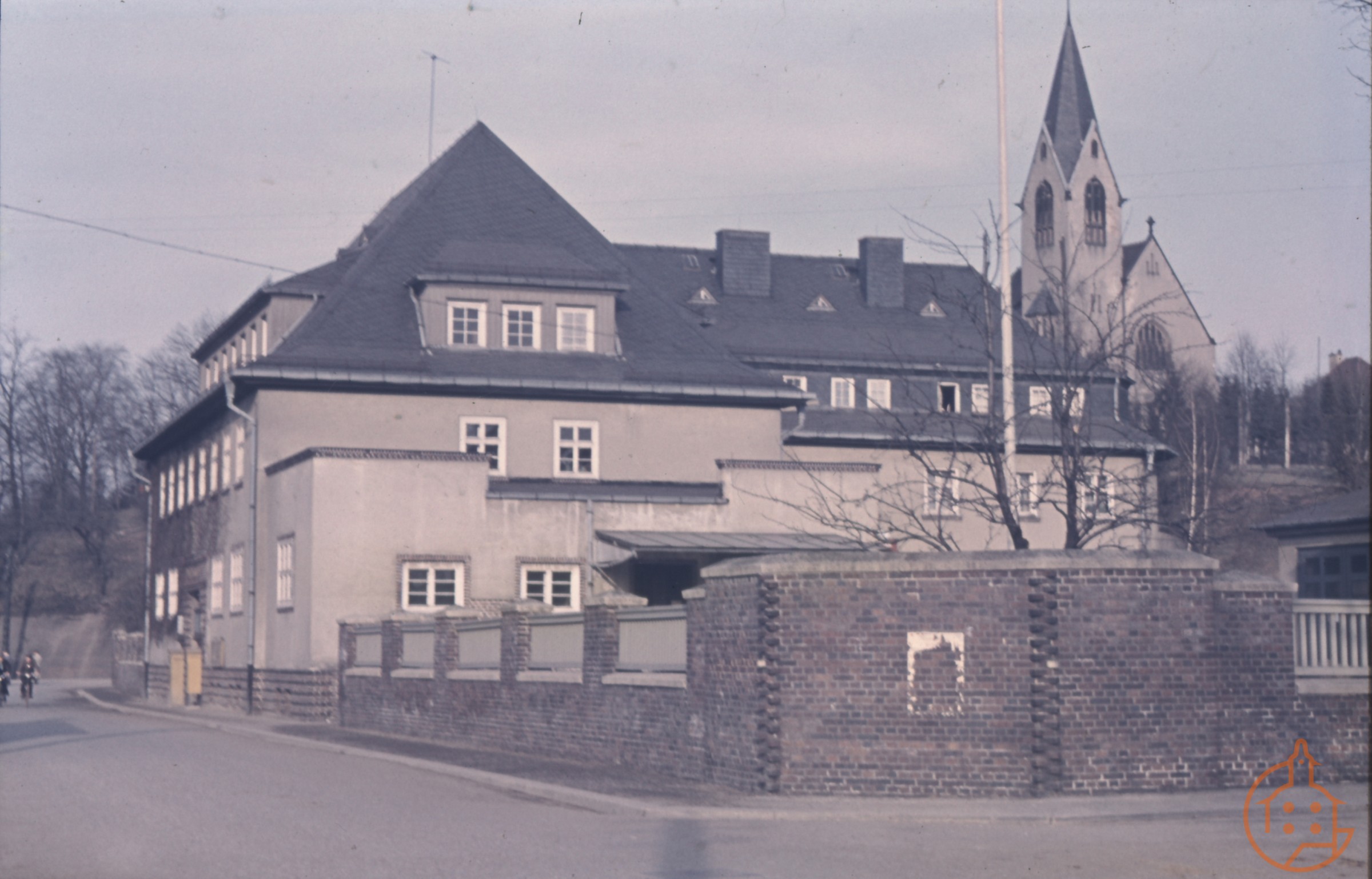 Postgebäude mit Katholischer Kirche im Hintergrund