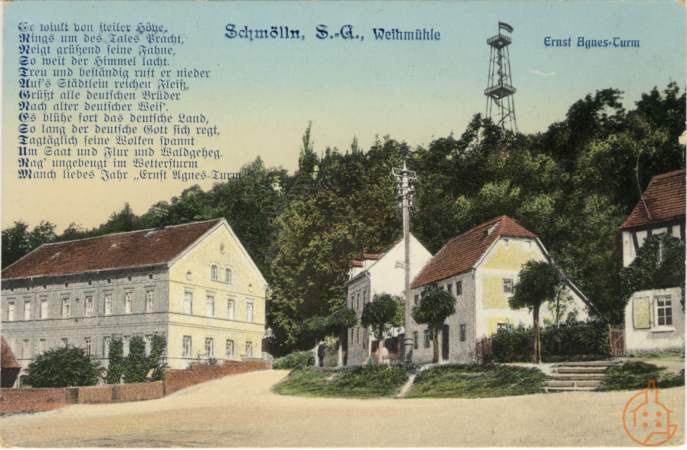 Ronneburger Straße mit Weihmühle und Blick zum Aussichtsturm (Ernst-Agnes-Turm) - mit Gedicht