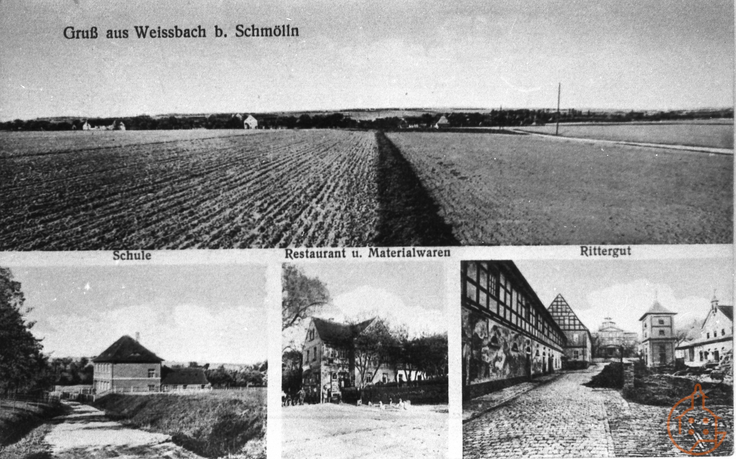 Schule, Rittergut, Restaurant und Materialwaren sowie Feld in Weißbach