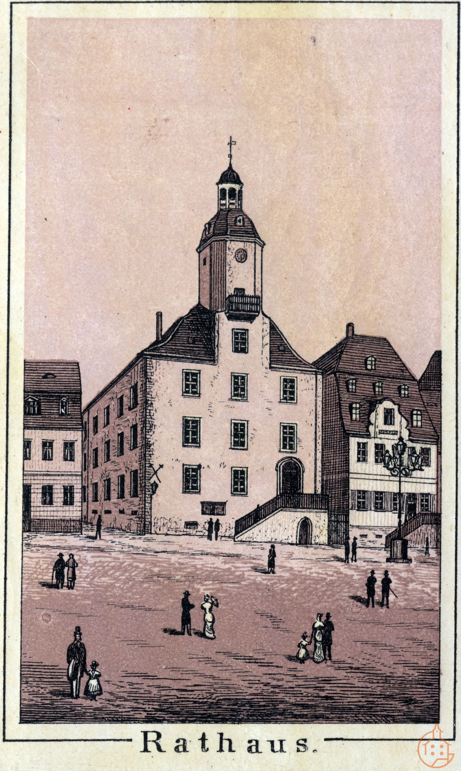 Lithographie color. des Rathauses aus dem "Album von Schmölln"