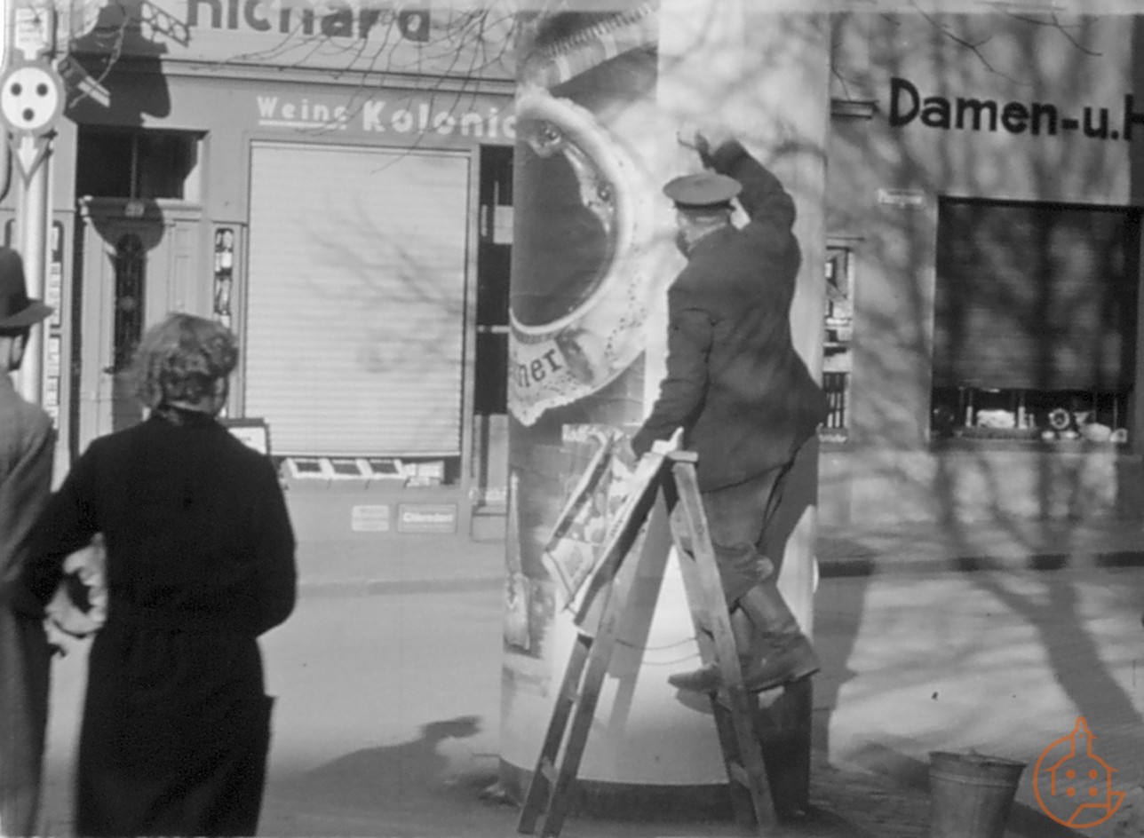 Richard Mehlhorn beim Bekleben einer Liftfaßsäule