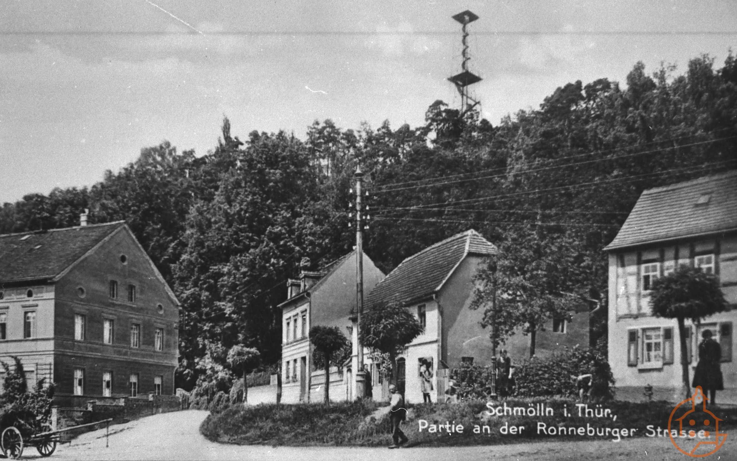 Ronneburger Straße mit Weihmühle und Blick zum Aussichtsturm (Ernst-Agnes-Turm)
