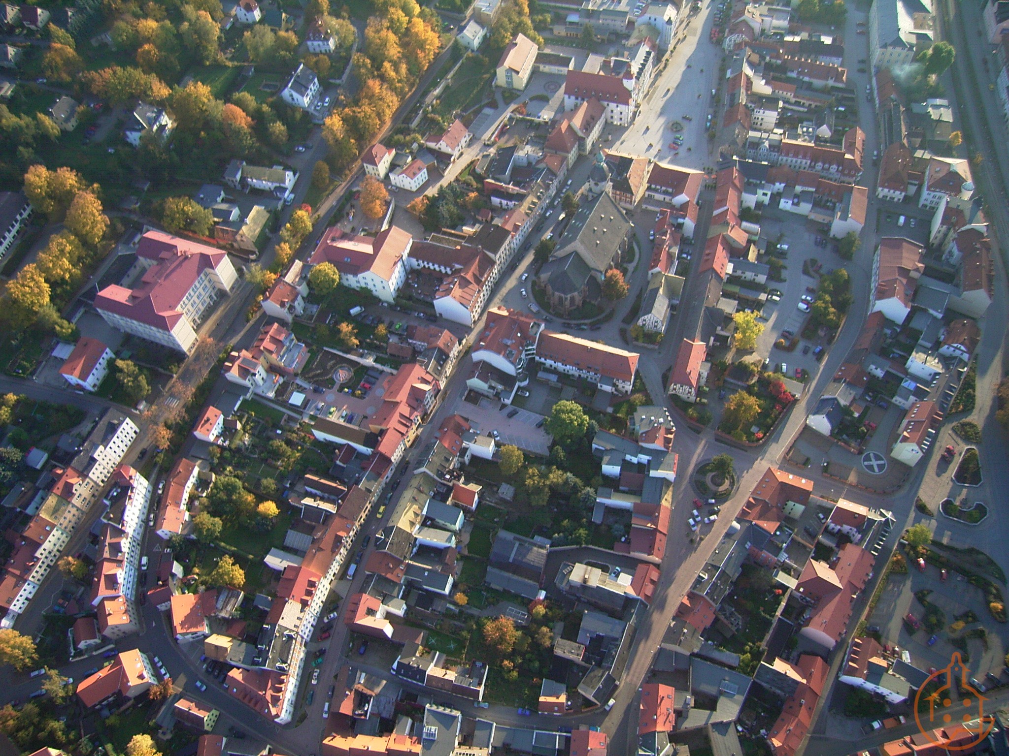 Blick auf Schmölln mit Markt, Stadtkirche St. Nicolai, Kirchplatz, Gößnitzer Straße, Regelschule "Am Eichberg", Goetheplatz (Luftaufnahme)