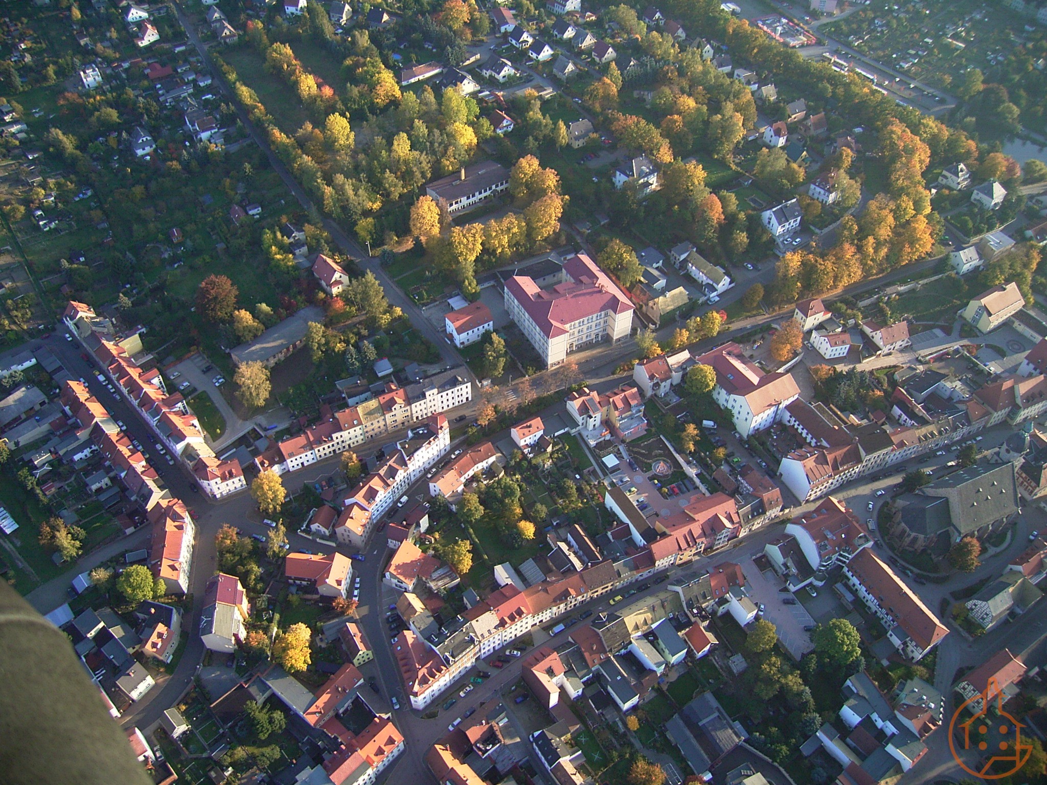 Blick auf Schmölln mit Stadtkirche St. Nicolai, Kirchplatz, Gößnitzer Straße, Schulstraße, Regelschule "Am Eichberg", Am Vereinshaus, Feldstraße (Luftaufnahme)