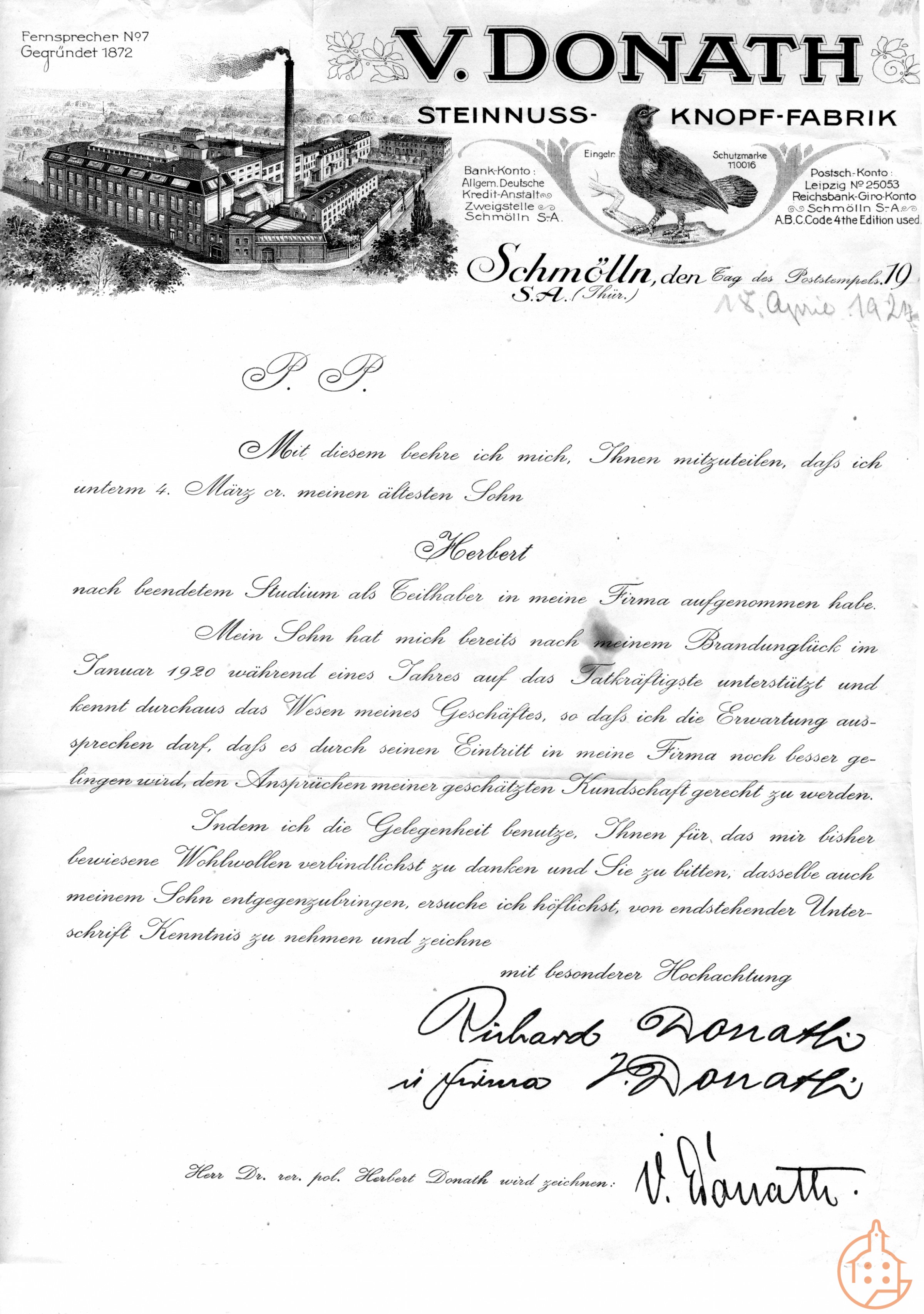 Schreiben von Richard Donath der Knopffabrik Valentin Donath über die Einsetzung seines Sohnes Herbert als Teilhaber