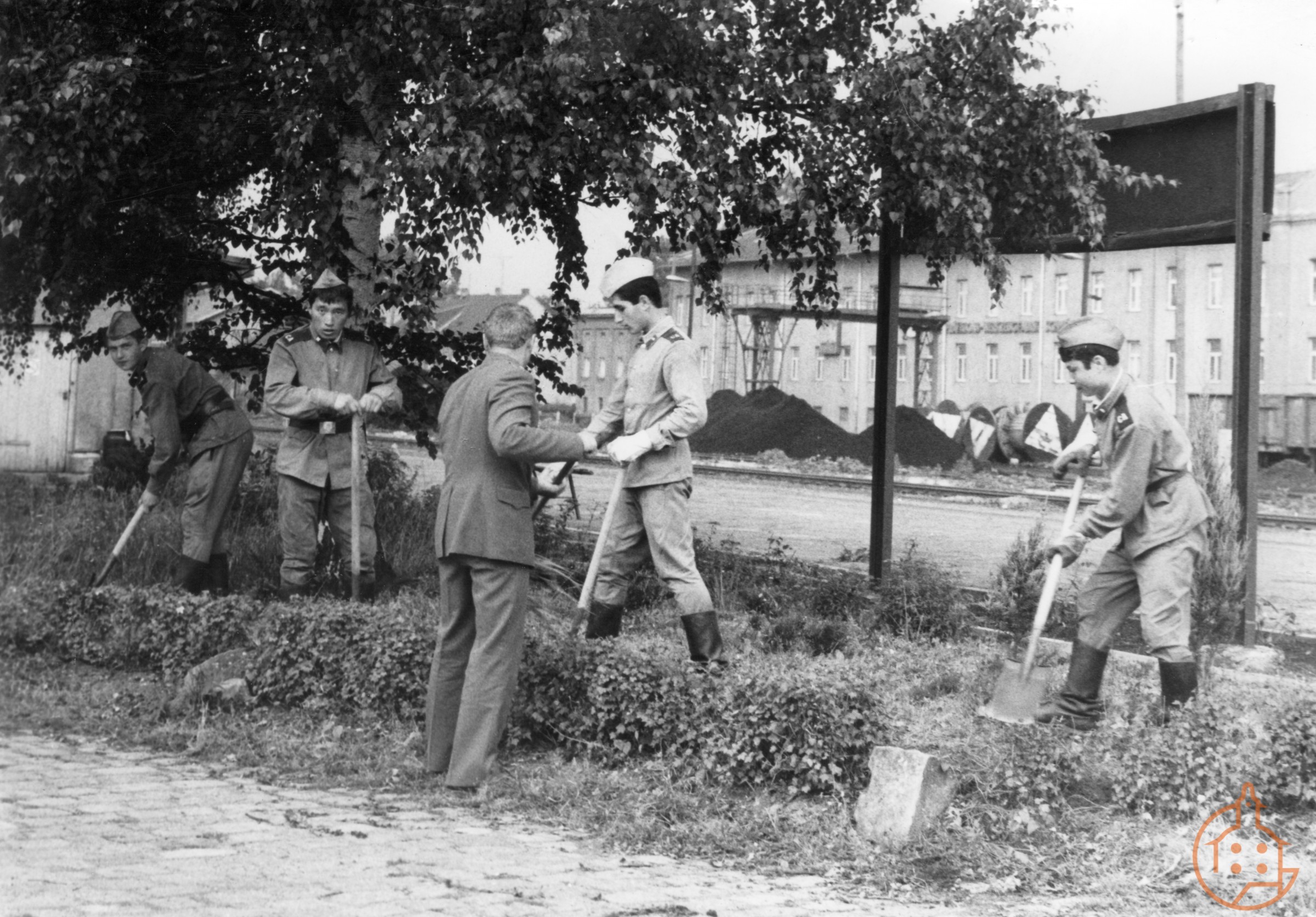 Sowjetische Soldaten bei der Arbeit in der Grünanlage am Bahnhof, im Hintergrund die PWS