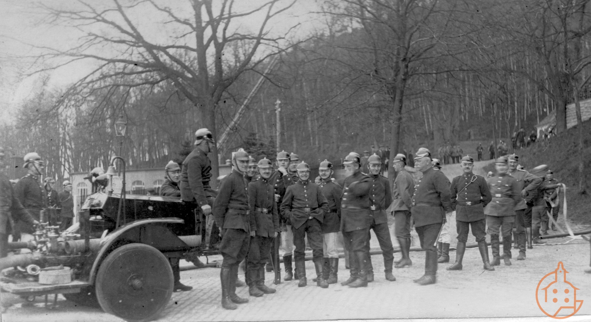 Spritzenzug I mit der 1926 gekauften Fischer-Lafettenspritze (1000 Ltr/min) bei einer Übung am Waldhaus