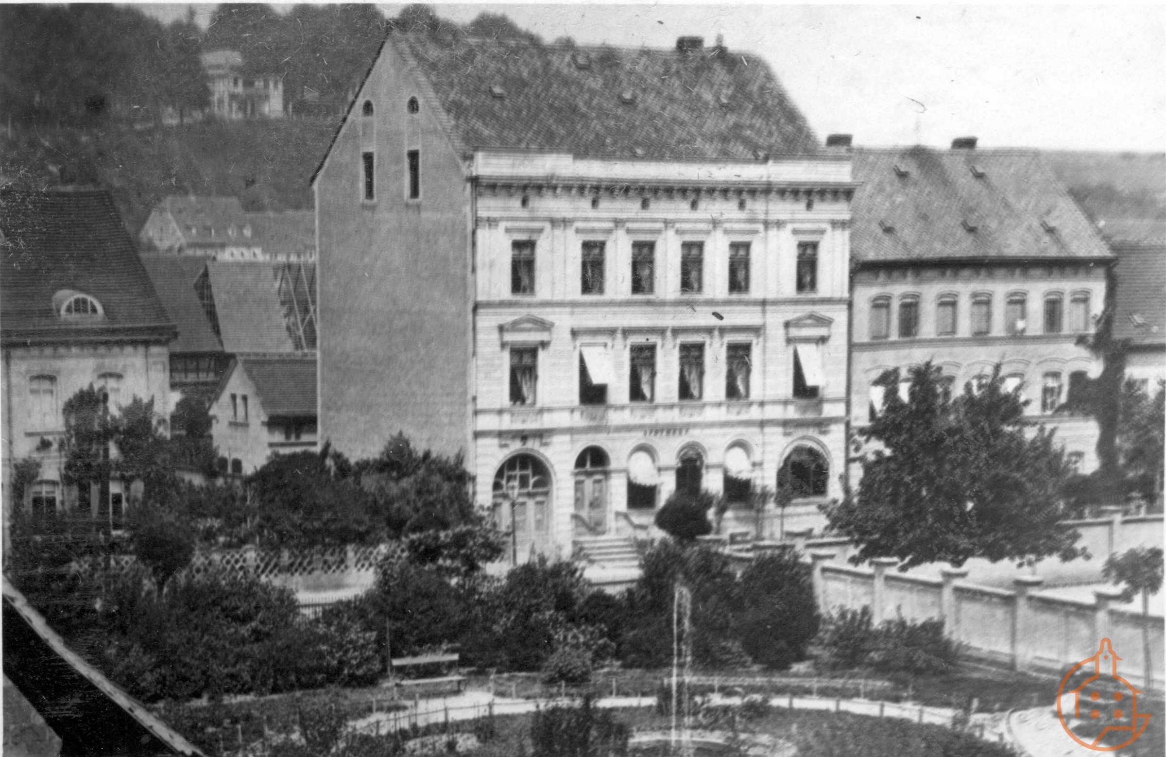 Stadtapotheke in der Bahnhofstraße (Altenburger Straße) mit Parkanlage an der Schloßstraße