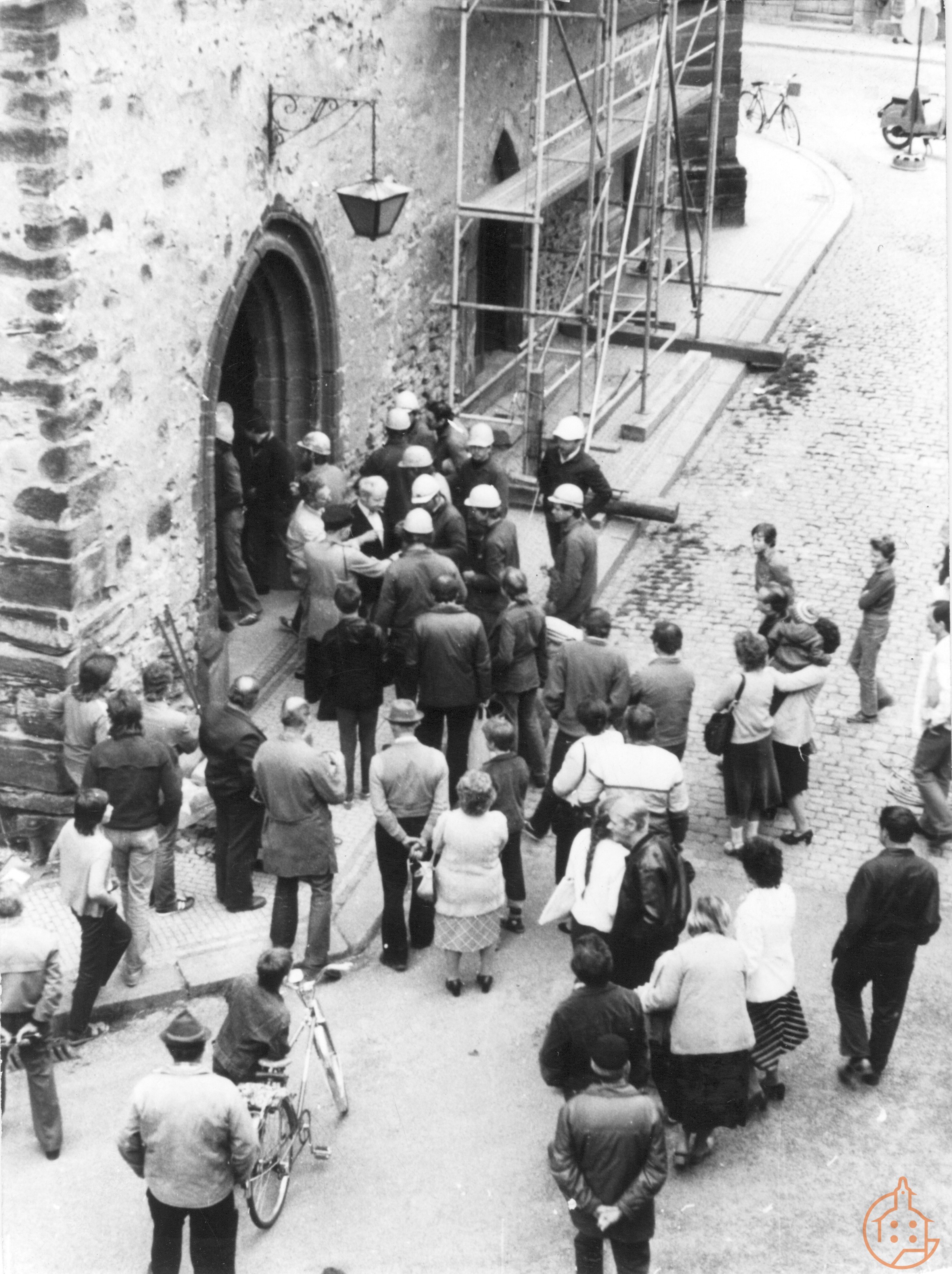 Pfarrer Eisner mit Bauarbeitern und Besuchern vorm Eingang der eingerüsteten Stadtkirche St.Nicolai