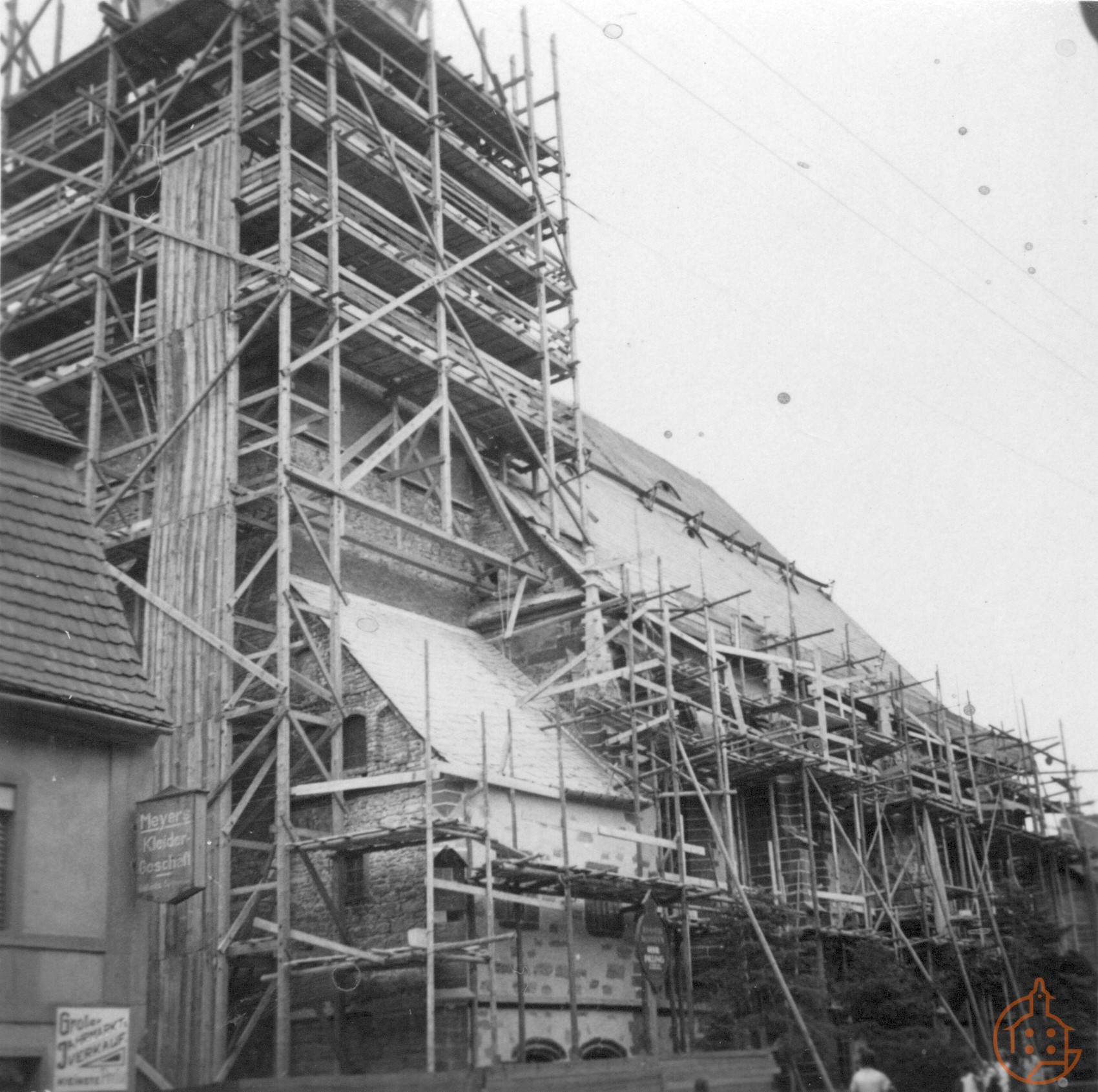 Eingerüstete Südseite der Stadtkirche St. Nicolai zwecks Sanierungsarbeiten (Blick von der