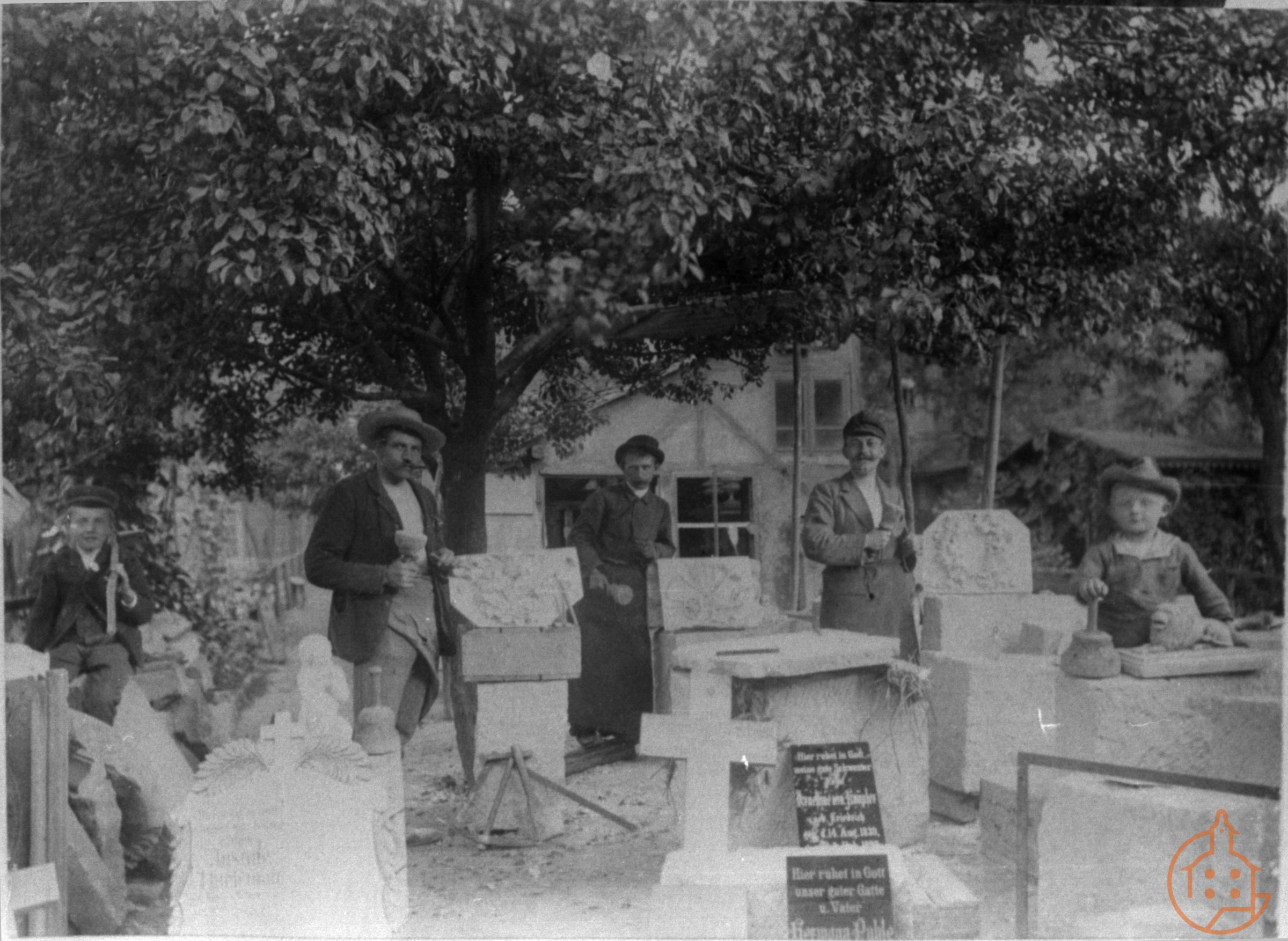 Steinmetze bei ihren Arbeiten, Grabsteine