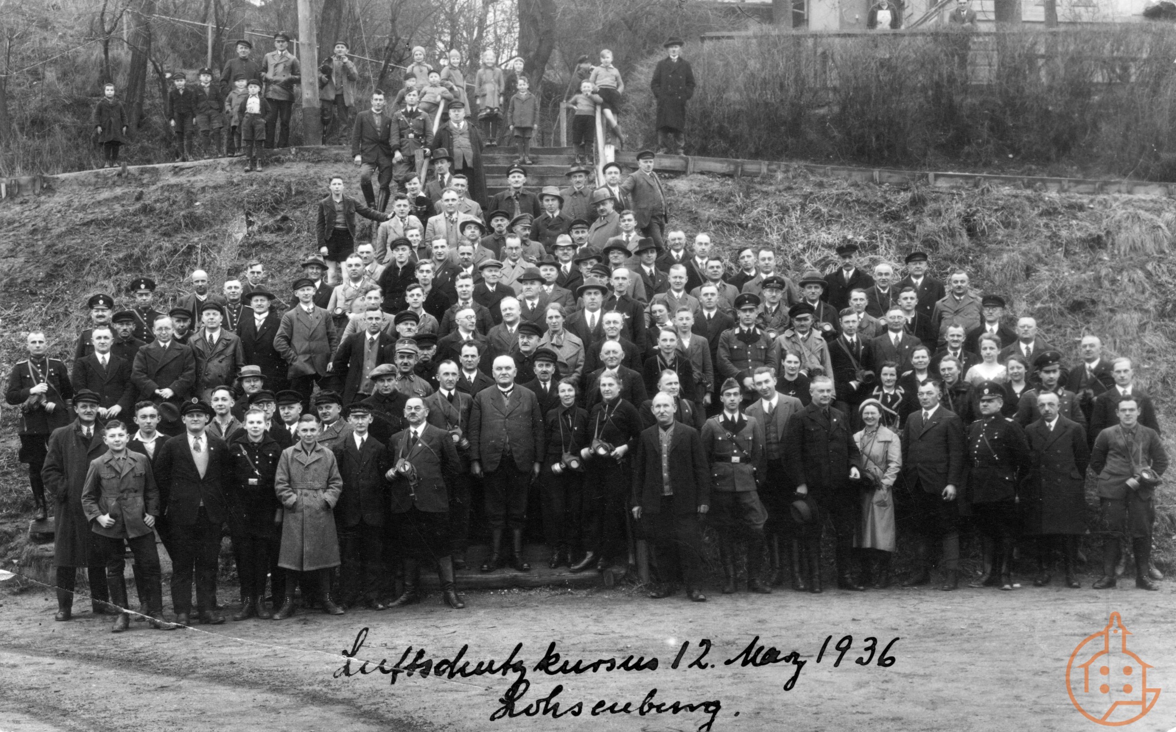 Teilnehmer des Luftschutzkursus, teilweise mit Gasmasken, vor der Lohsenburg
