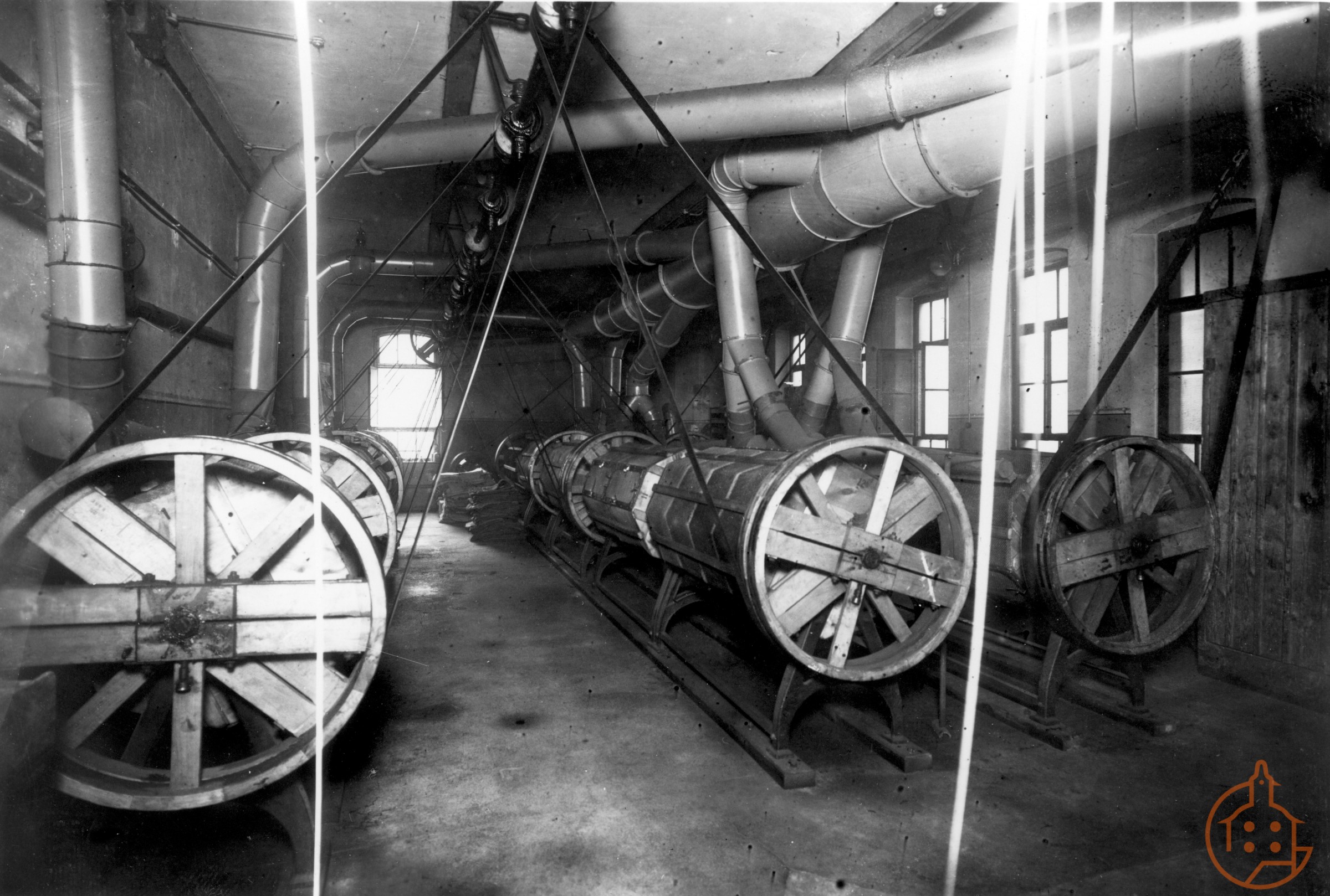 Rotierende Fässer und Luftleitungen, mit Transmission.
