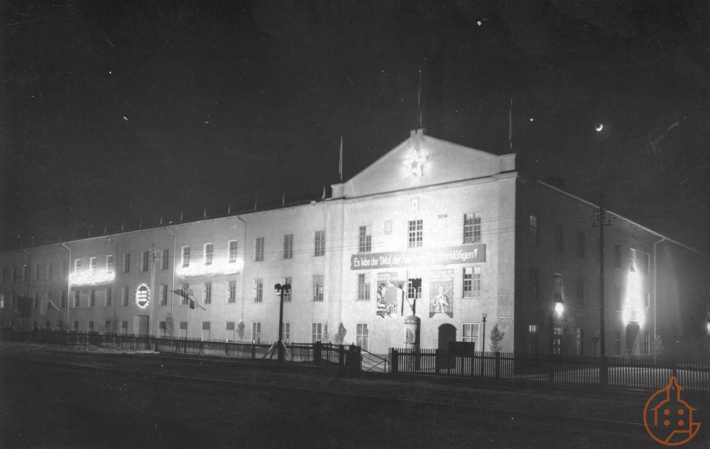 Beleuchtetes Gebäude des VEB PWS