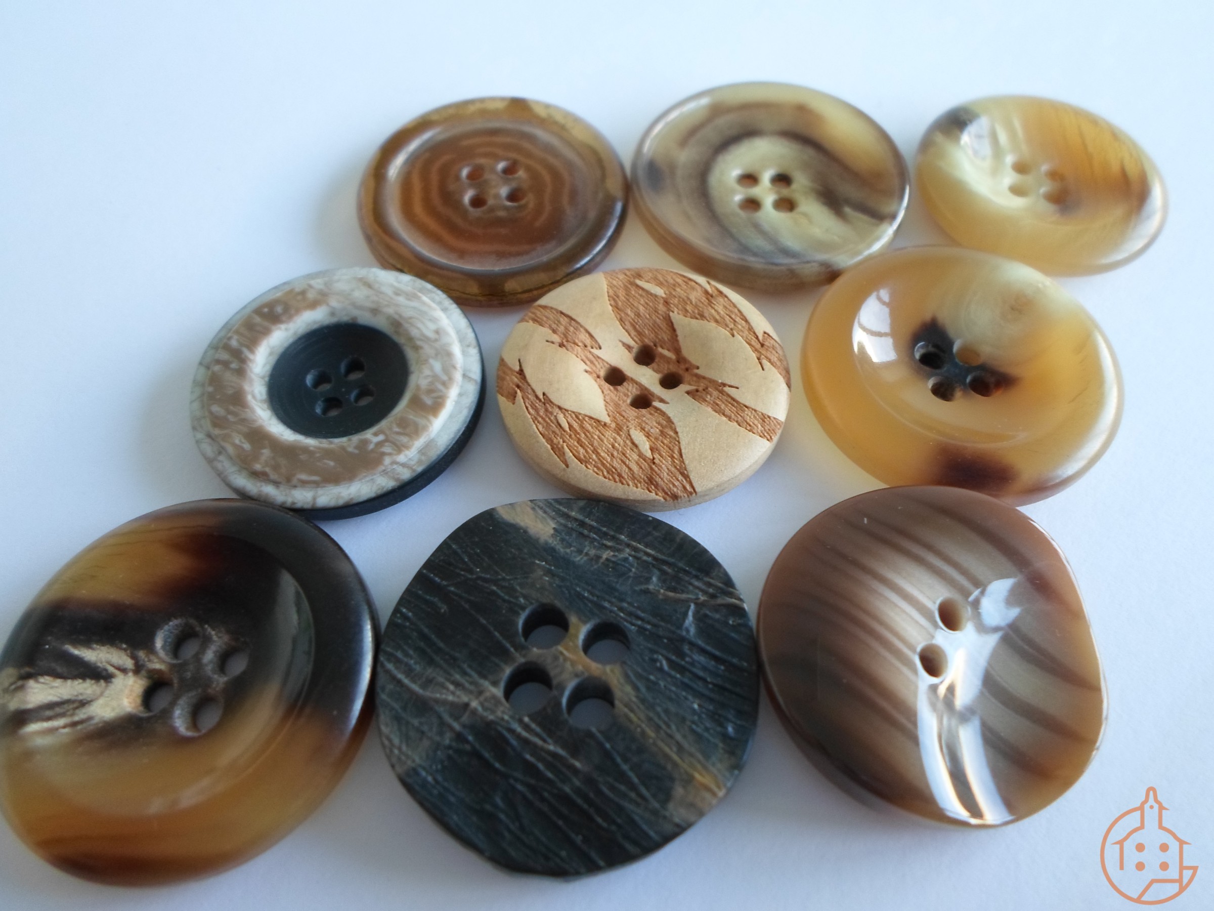 neun verschiedene Knöpfe, Horn und Polyester arrangiert