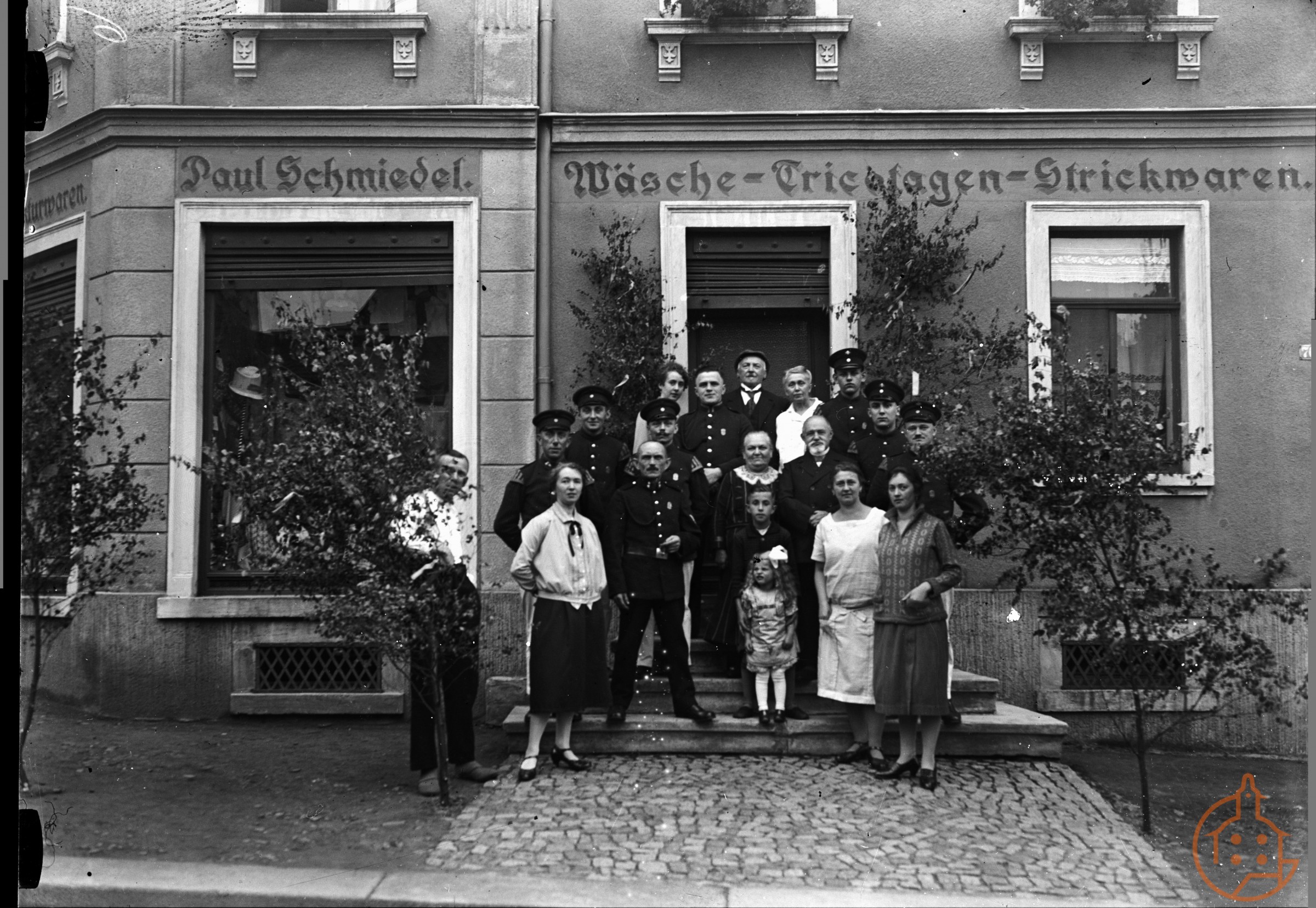 Gruppenfoto vor dem Wäschegeschäft von Paul Schmiedel