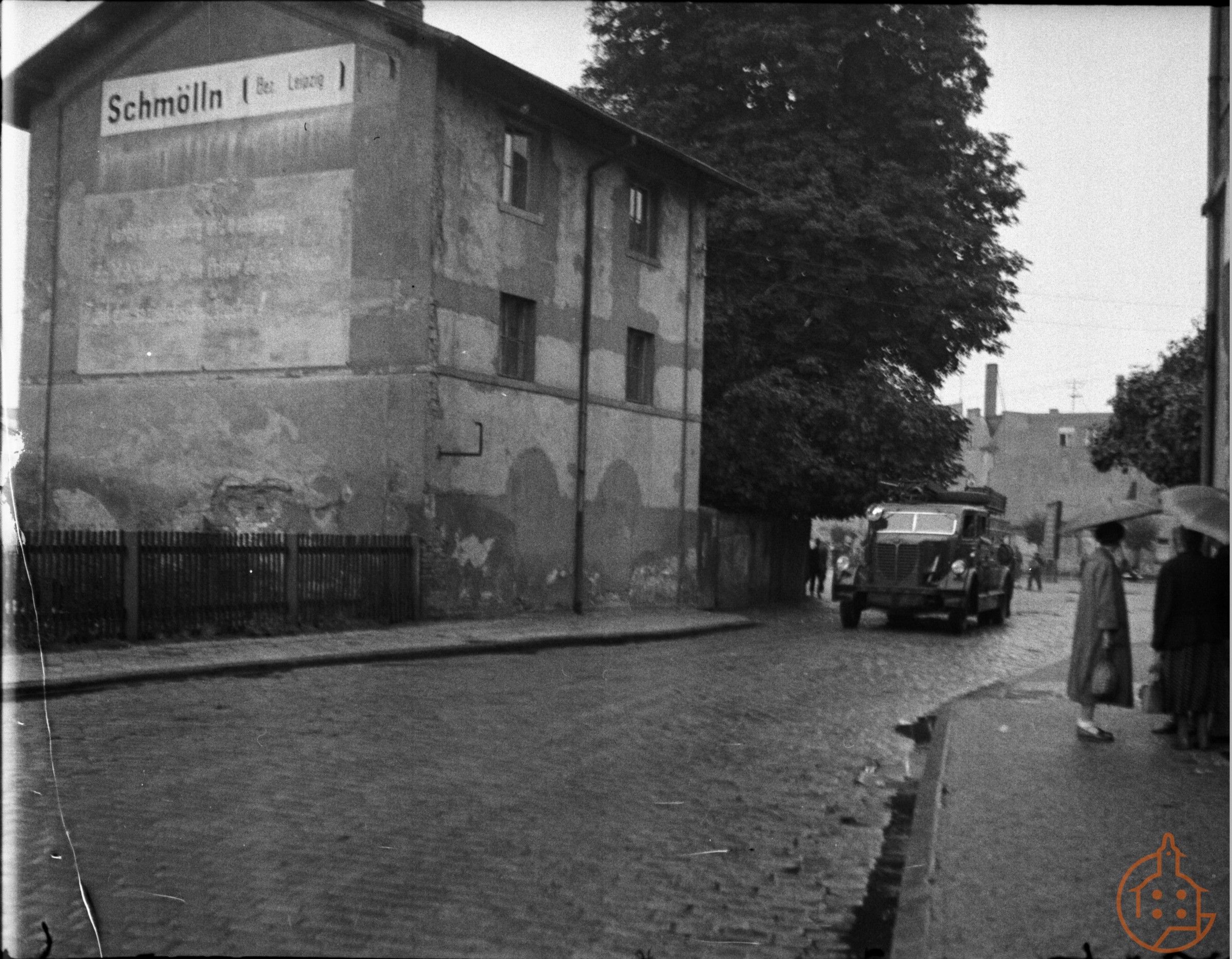 Bahnhofsplatz mit Wasserhaus für die Dampflokomotiven, LF 25 Büssing der Feuerwehr