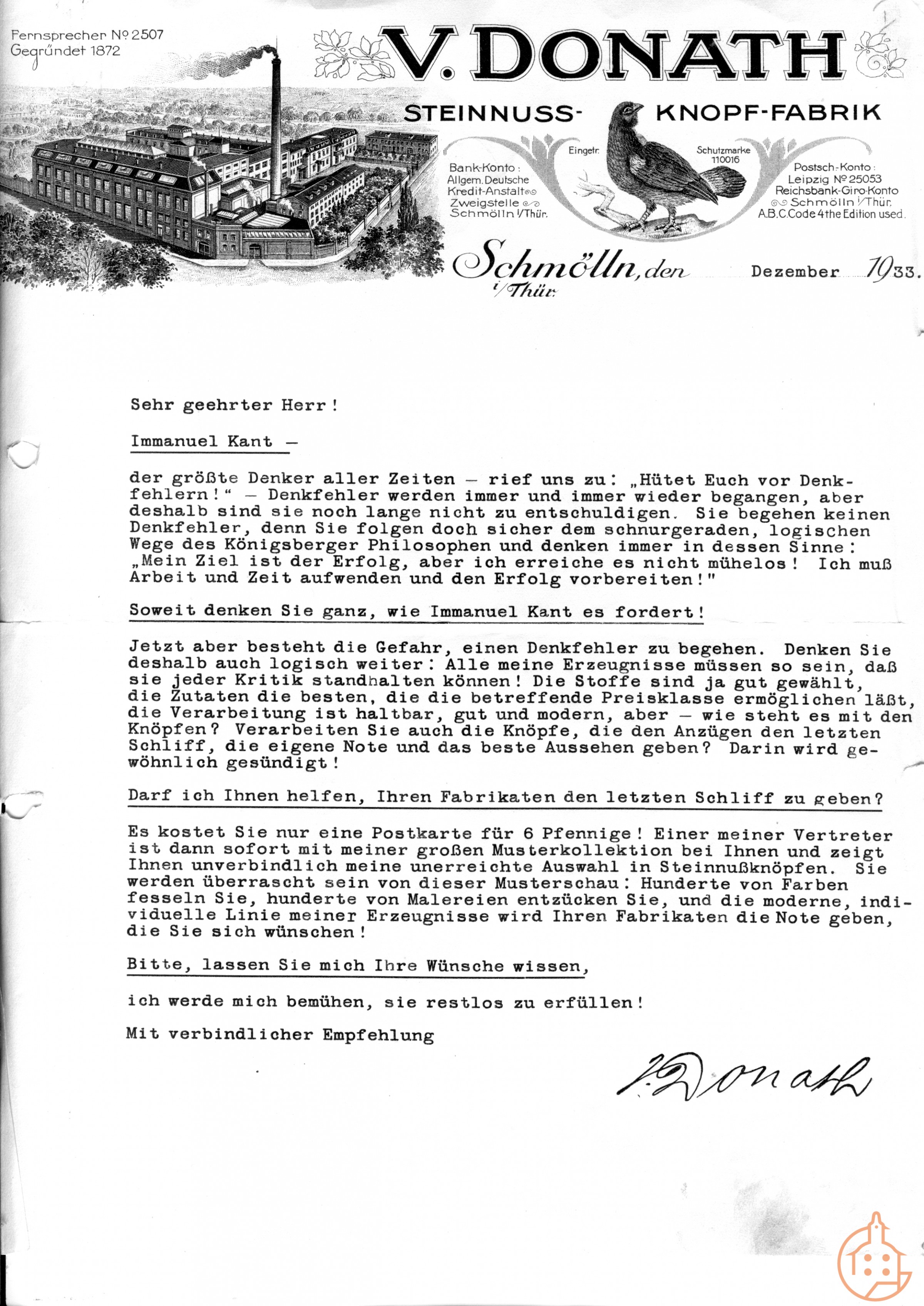 Werbeschreiben der Knopffabrik Valentin Donath