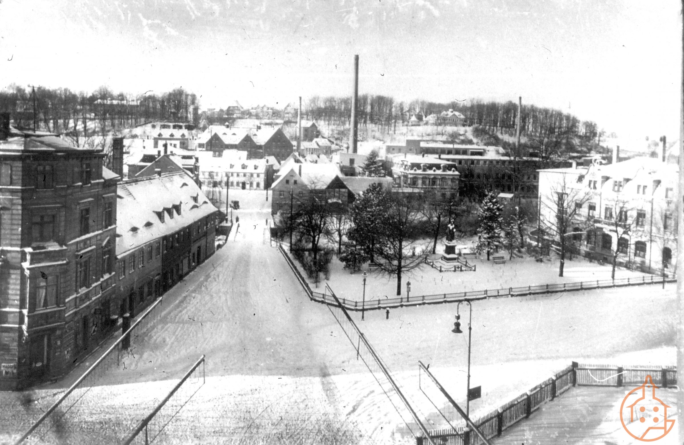 Blick von oben vom Bahnhofsplatz auf den Schillerplatz im Winter