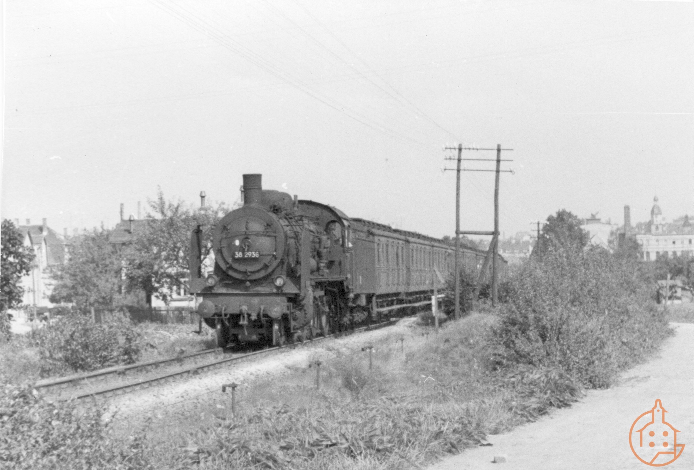 Zug mit Dampflokomotive der Baureihe (BR) 38 (P 8) bei der Durchfahrt durch Schmölln (Bahnübergang Weststraße)