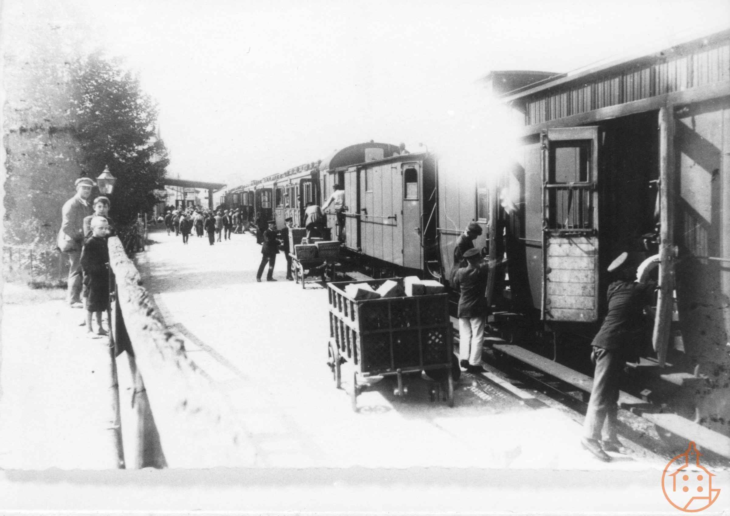 Zug im Bahnhof - Ein- und Ausstieg der Reisenden, Be- und Entladen der Gepäckwagen